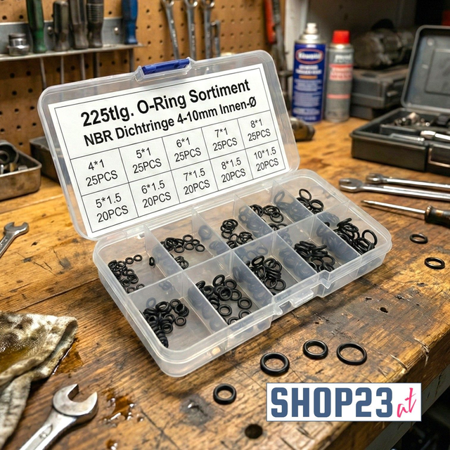 Zuverlässige Abdichtung: 225 O-Ringe aus hochwertigem NBR-Material Dieses umfangreiche 225-teilige O-Ring Sortiment ist ein Muss für jeden Handwerker, Mechaniker und Hobbyisten. Es bietet eine sichere und langlebige Abdichtung in den häufigsten Anwendungen. Die Dichtringe bestehen aus hochwertigem NBR (Nitrilkautschuk), das für seine ausgezeichnete Beständigkeit gegen Öle, Fette, Kraftstoffe und viele Chemikalien bekannt ist. Das Set enthält 10 verschiedene Innendurchmesser im Bereich von 4 mm bis 10 mm in praktischer Stückzahl, die alle ordentlich in einer robusten Sortimentsbox aufbewahrt werden. Ideal für Reparaturen an Sanitäranlagen, Motoren, Pumpen, Druckluftsystemen und allen Gehäusen, die eine zuverlässige Flüssigkeits- oder Staubabdichtung erfordern. Vorteile: Hohe Temperaturbeständigkeit, Langlebigkeit und professionelle Qualität (NBR). [E1/20251025]